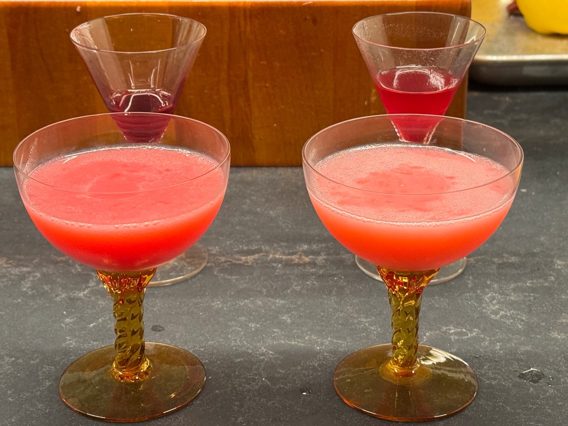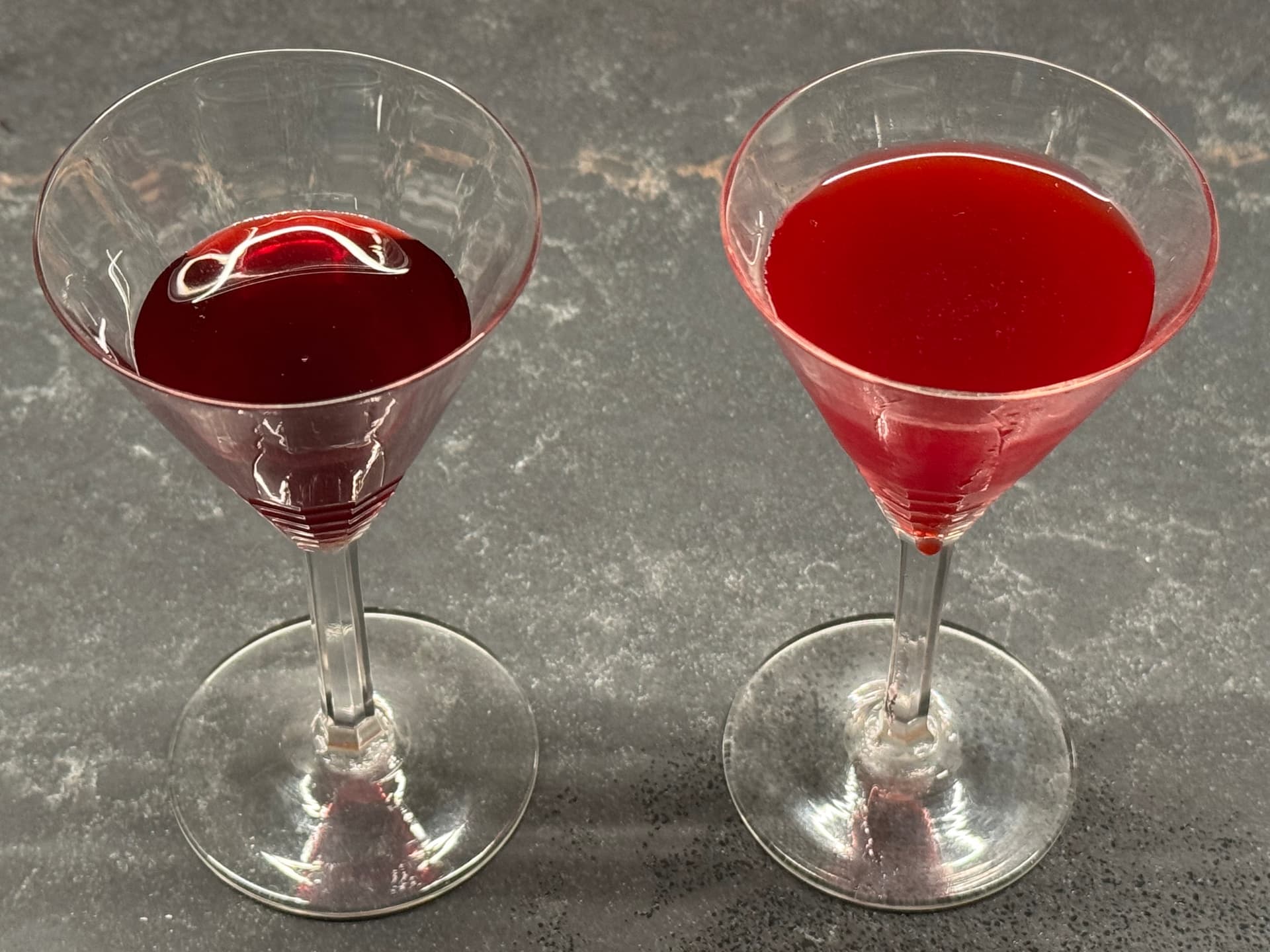 I then carefully made two identically bad Clover Clubs. They look sad because I am not a good bartender. Yes, there is egg white in there, but I deflated the foam through incompetence. The drinks are quite identical, except for the different syrups. (Those are all facts.) They are bad drinks because the Clover Club is a bad drink. (That is my opinion.)