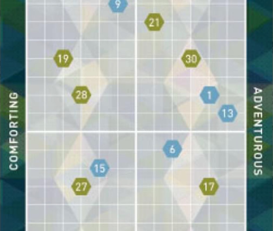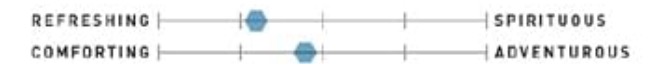 These were problematic in at least two ways. First, each represents a range between two loose abstractions. Second, their value is mainly comparative between drinks, and the menu is not designed in a way to encourage visual comparisons.
