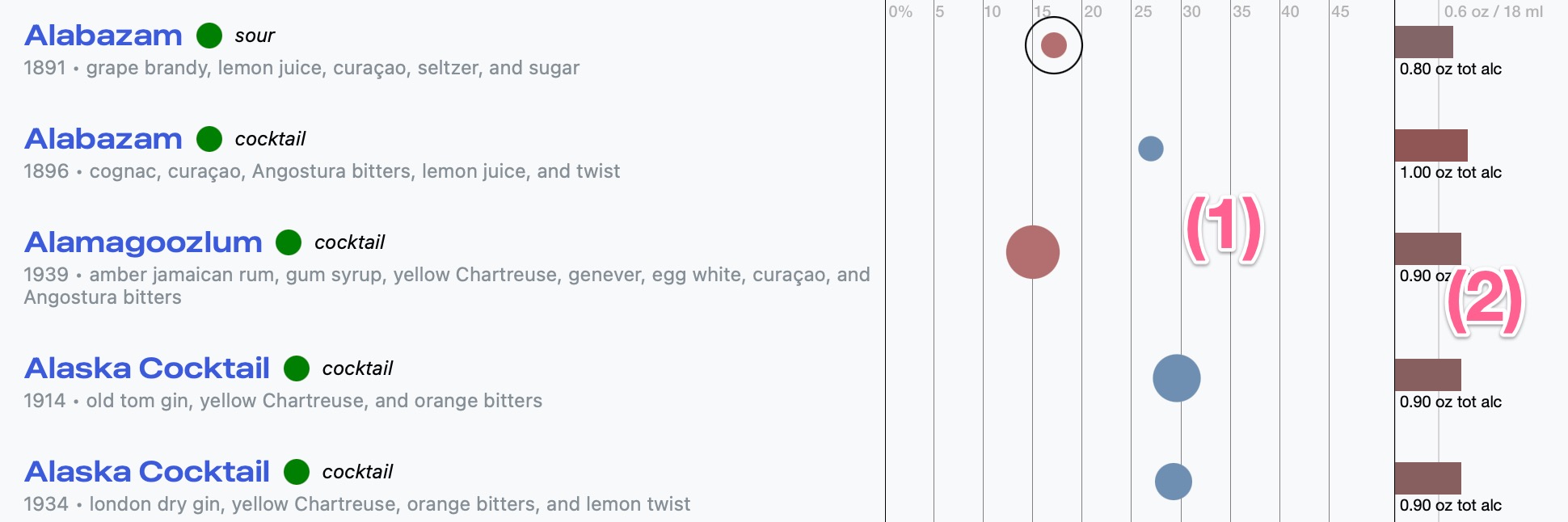 On these services, when you look at an index of recipes (if your screen is wide enough) you get a pair of visualizations in columns at the right. They’re in columns to facilitate visual comparison. The first visualization (1) is a variant of that created by Dave Arnold in his book Liquid Intelligence, that expresses three aspects of flavor concentration: ABV, sweetness and acidity. Once you know how to read the graph, you can immediately see that the two Alabazam recipes are wildly different, with the first being dramatically more diluted and acidic than the second. You can see that the first Alaska recipe is sweeter than the second. The second column of graphs (2) represents the absolute strength of each drink relative to one standard US drink, and in comparison with each other. In this case, all five drinks are similarly on the stronger side.