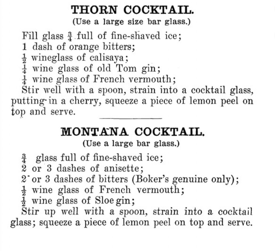 I recently tried the “Montana Cocktail” from Harry Johnson and it’s sensational, though using Boker’s as Harry commands is likely a big part of its success. I don’t see any such recipe in “Julian’s Recipes” though, so I’m wondering where it came from. I also wondered if it might have switched names with the adjacent “Thorn Cocktail,” given so many sloe recipes’ names allude to the sloe’s British name of “blackthorn.”