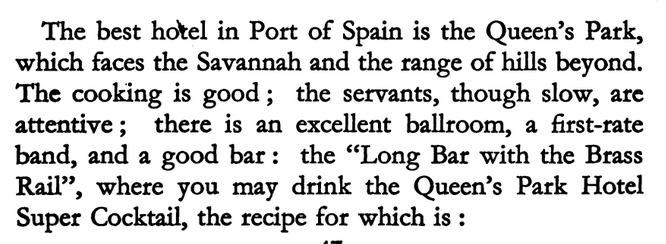Berry and Difford’s Guide both tie the drink back to the 1932 travel book If Crab No Walk: A Traveller in the West Indies by Owen Rutter. The hotel’s eponymous swizzle makes sense given the time-honored tradition of swizzled drinks in the Caribbean, but the QPHSC seems a little bit out of left field. From my digging, I could only ascertain that Berry dug up the QPHSC from Rutter’s book, featured it in Potions and it has slowly been popping up here and there within the cocktailing world. It seems to have been completely lost to time between 1932 and 2014.
